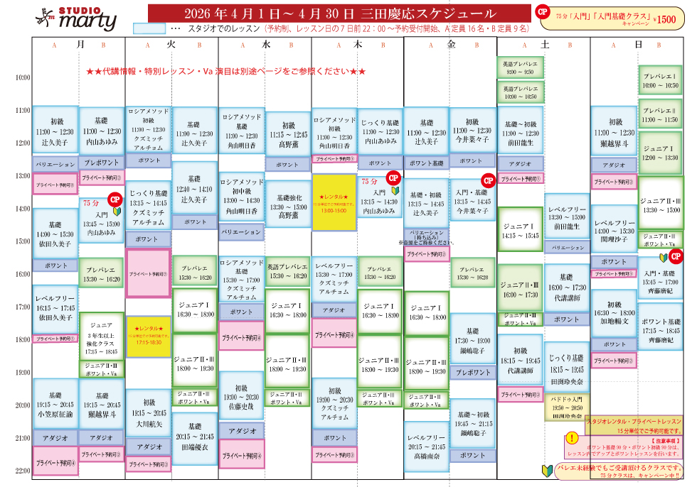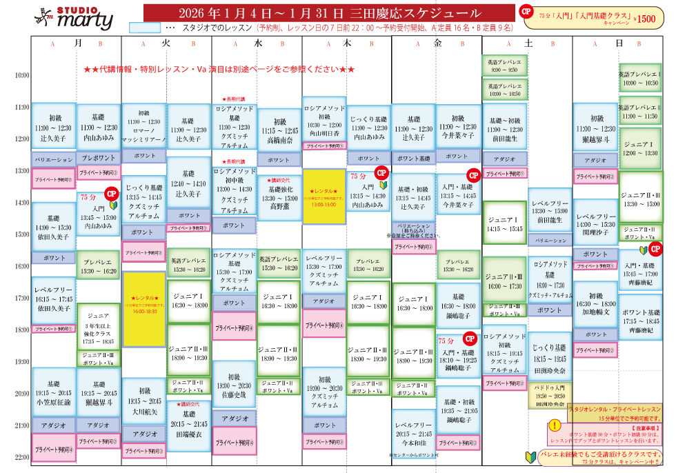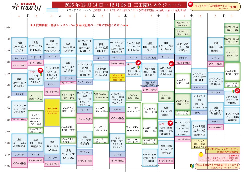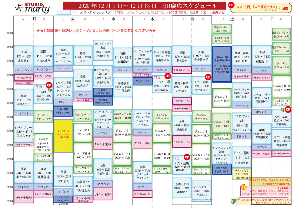 スタジオマーテイ東京三田慶応のスタジオレッスンスケジュール